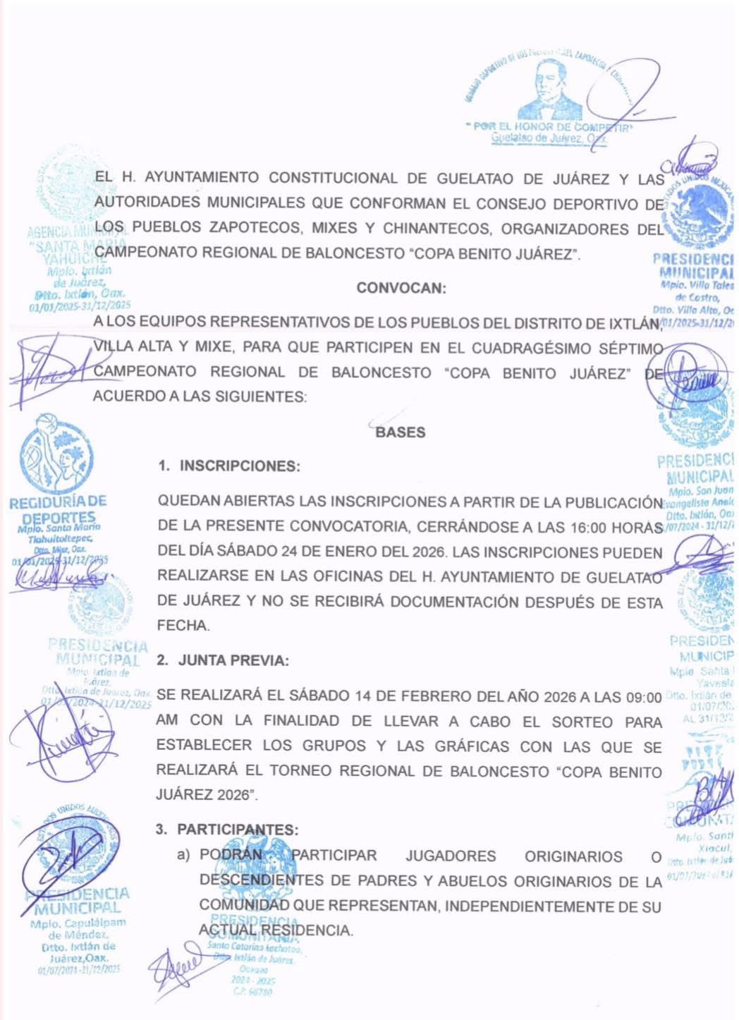 El H. Ayuntamiento de Guelatao de Juárez y Consejo Deportivo emiten la: 𝐂𝐎𝐍𝐕𝐎𝐂𝐀𝐓𝐎𝐑𝐈𝐀 𝐃𝐄𝐋 𝐓𝐎𝐑𝐍𝐄𝐎 𝐂𝐎𝐏𝐀 "𝐁𝐄𝐍𝐈𝐓𝐎 𝐉𝐔Á𝐑𝐄𝐙" 𝟐𝟎𝟐𝟔